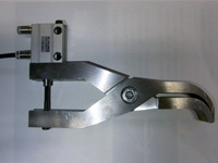 専用クリッパーはエアシリンダーの力で刃材をホールドするので 両手が自由になり、より作業に集中できます。写真のような短い 刃材でもしっかり保持できます。この他にも、様々な治具を開発中です。 |